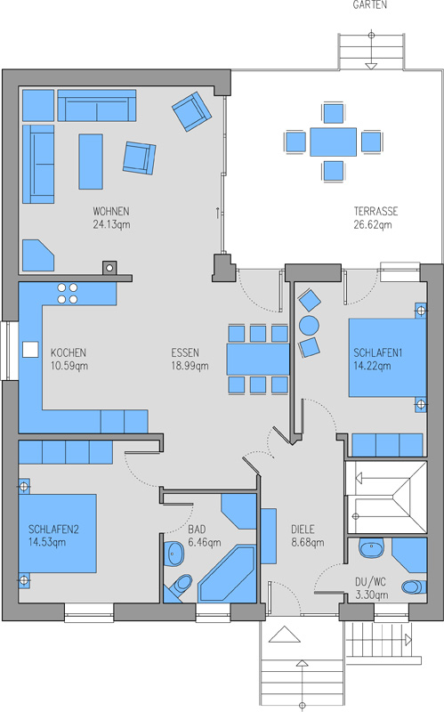 Erweitert wird der Lebensraum noch durch eine großzügige Terrasse, die schon früh am Morgen zum Verweilen einlädt. Auch ein Kleinkindbett finden Sie im Hause vor.